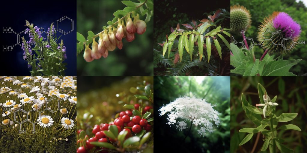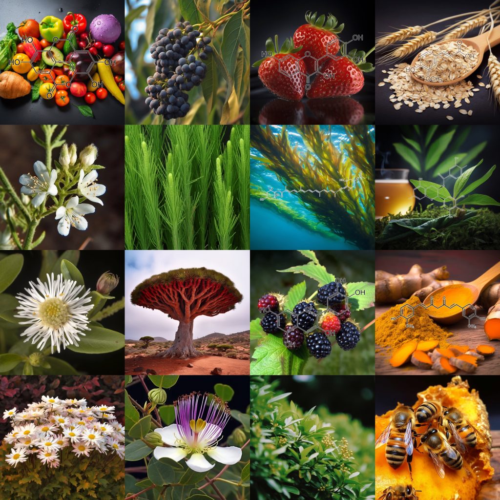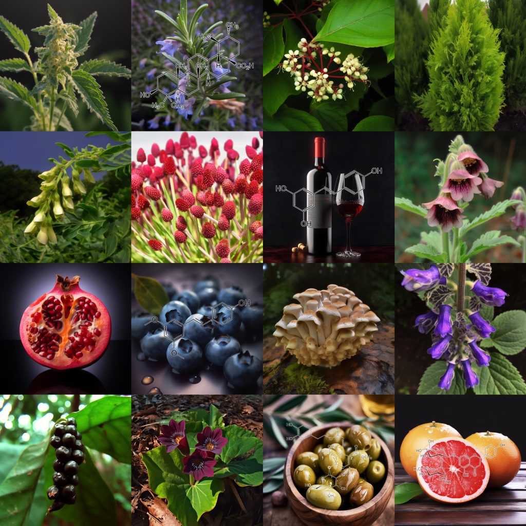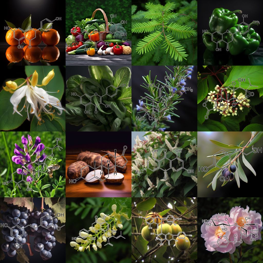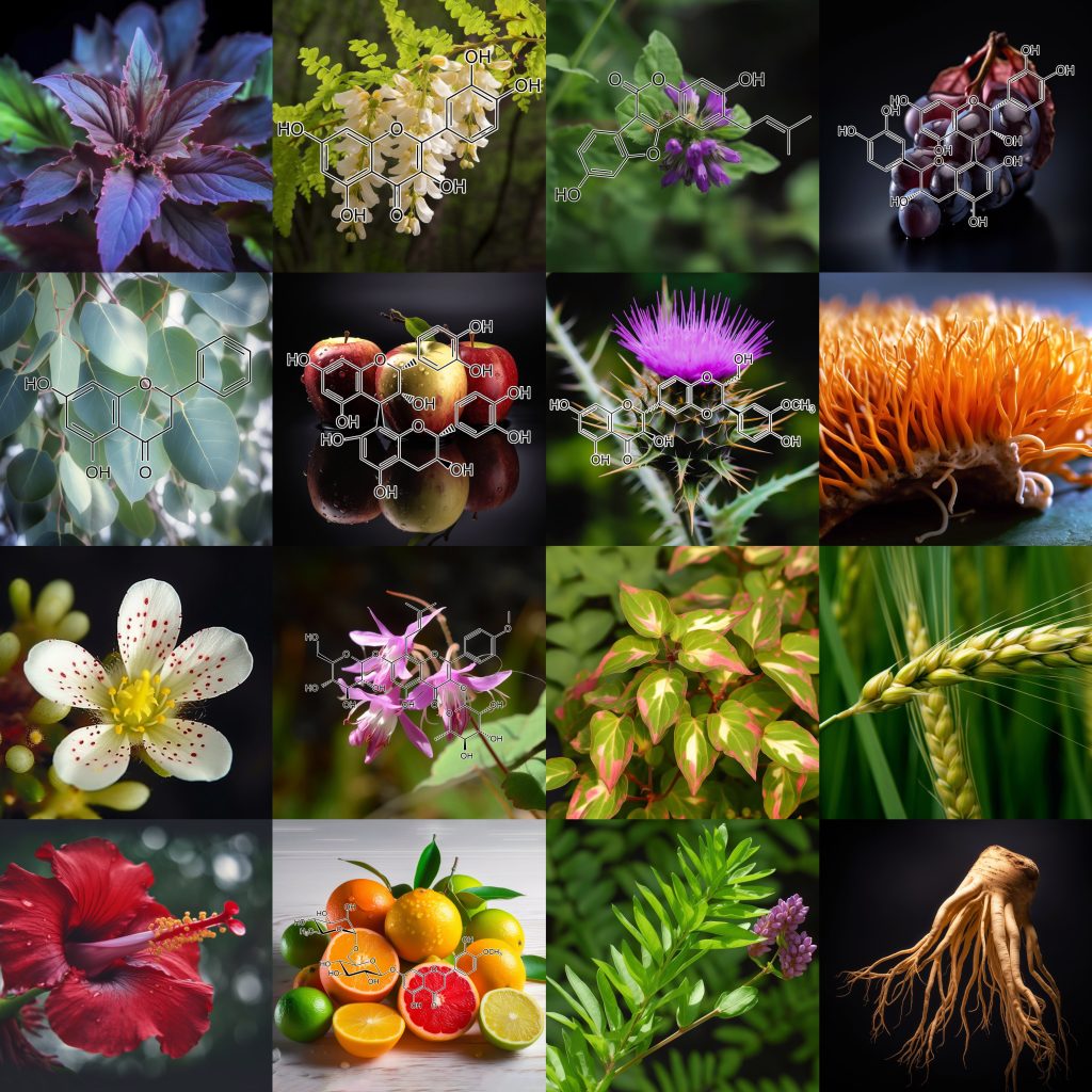 INGREDIENTS: Andrographolide (Andrographis paniculata) • Anthocyanins • Apigenin • Arctigenin (from Fructus Arctii) • Asiasari radix • Astragali radix • Baicalin • Brazilian propolis extract powder • Buxus wallichiana Baill (Buxaceae) • Capparis spinosa • Carnosol • Ceratonia siliqua pod extract • Chrysanthemum zawadskii • Cordycepin • Cranberry peel • Curcumin • Cyanidin • Cycloastragenol • DHEA • Dragon’s Blood from Croton lechleri • Eclipta prostrata • EGCG • Ellagic acid • Emodin • Equisetum arvense • Fermented barley extract • Ferulic acid • Fucoxanthin • Ginseng radix • Glycyrrhiza glabra root extract • Grape seed proanthocyanidin extract • Hesperidin • Hibiscus rosa-sinensis L. flowers • Houttuynia cordata • Hydroxytyrosol • Icariin • Isorhapontigenin • kaempferol • Kolaviron • Kurarinone (From roots of Sophora • Ligustri fructus • Lonicera japonica flower • Luteolin • Metasequoia glyptostroboides leaves &bark extract • Myricetin • N-acetyl- glucosamine • Naringenin • Naringin • Paeoniflorin • Perilla frutescens var. acuta (PFVA) • Pinocembrin • Piper nigrum extract (Piperaceae) • Plectranthus barbatus extract • Polyporus umbellatus • Pomegranate peel extract • Procyanidins from apple peel • Psoralea corylifolia (psoralidin) • Pterostilbene • Quercetin • Radix Angelicae sinensis • Rehmannia glutinosa • Resveratrol • Sanguisorba officinalis • Silibinin • Sophora flavescens root • Tripterygium wilfordii (Celastrol) extract triptolide • Ursolic acid • Urtica dioica